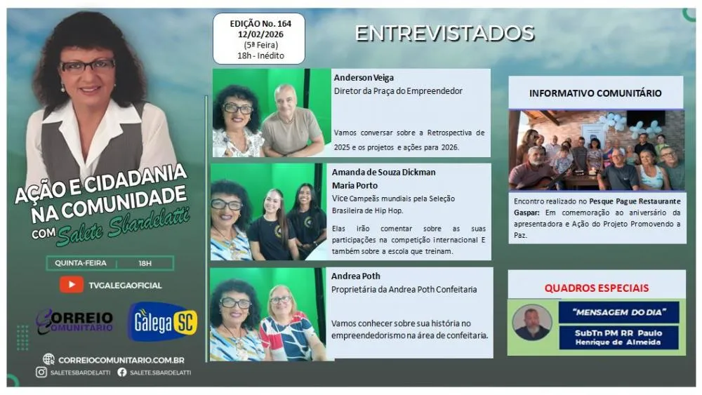 Na edição exibida em 12 de fevereiro de 2026, o programa apresenta uma construção narrativa plural, transitando entre empreendedorismo, cultura e vivências comunitárias, sempre ancorado em seu propósito central de humano e fortalecimento coletivo. A condução de Salete Sbardelatti, marcada por sensibilidade e clareza, aliada à realização do Correio Comunitário e à parceria com a TV Galega, sustenta o programa como um ponto de convergência entre diferentes perspectivas.